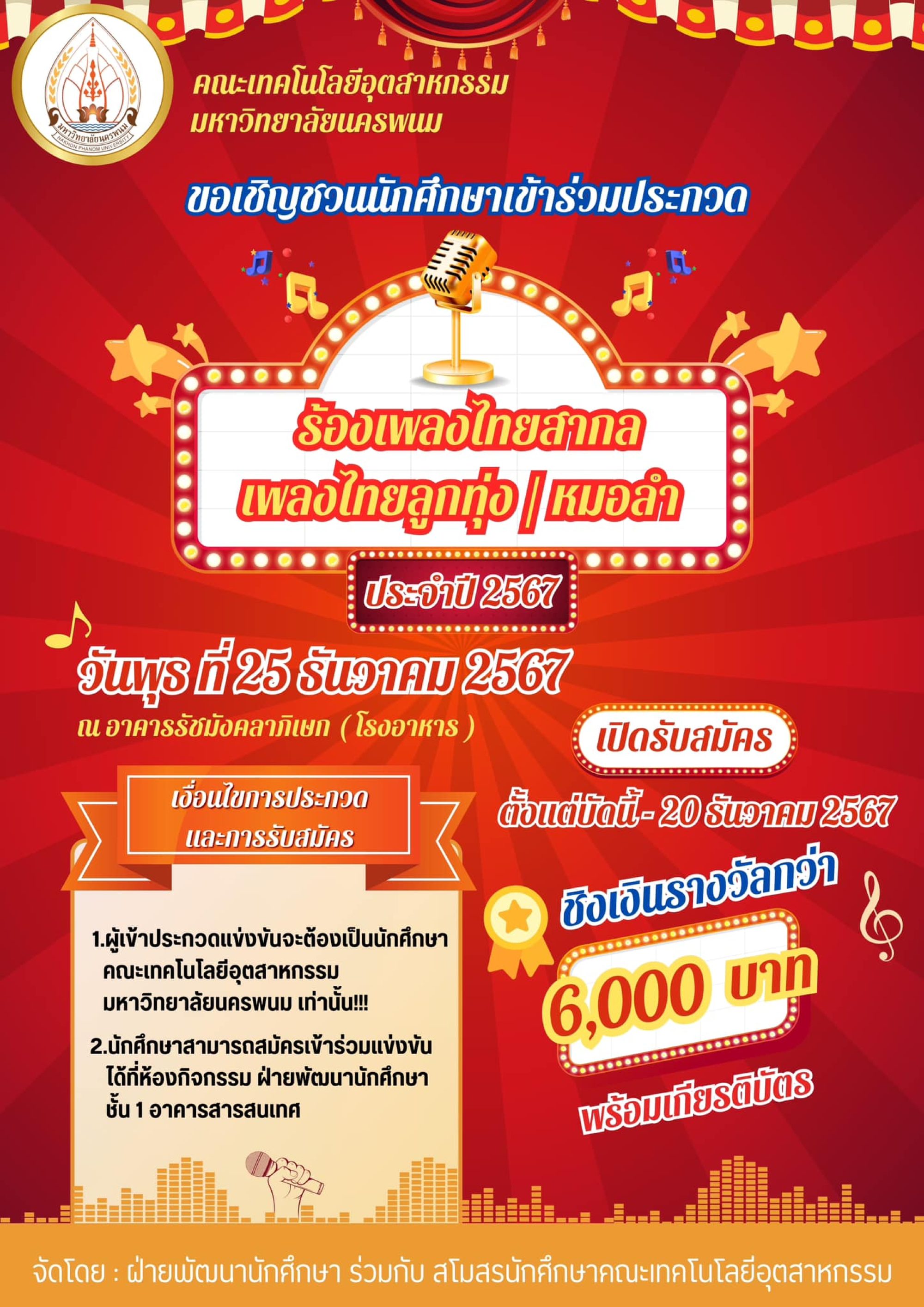 ประกวดร้องเพลงไทยสากล ,เพลงไทยลูกทุ่ง-หมอลำ ในวันพุธ ที่ 25 ธันวาคม 2567 ณ อาคารรัชมังคลาภิเษก (โรงอาหาร) คณะเทคโนโลยีอุตสาหกรรม มหาวิทยาลัยนครพนม ![]()
